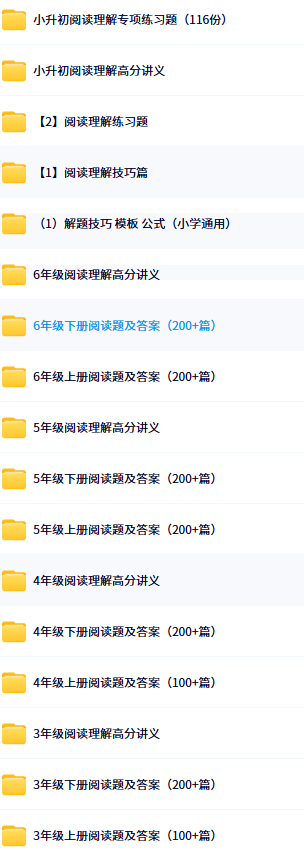 小学语文阅读理解电子资料,主要包含小学语文阅读理解答题模版、万能公式及专项训练等内容,该资料适合3-6年级学生使用。其中小升初阅读理解专项练习题共116份。会员百度网盘免费下载。