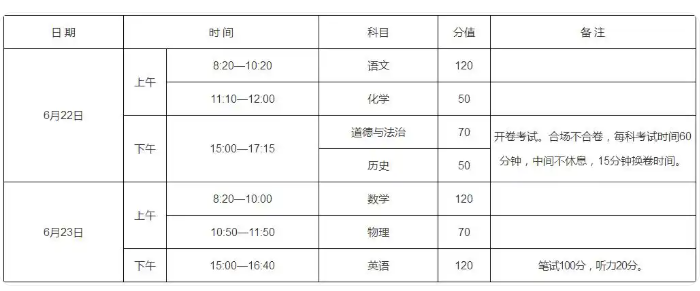 根据2025年5月月16日河南省教育厅发布《2025年河南省普通高中招生政策解读》,2025年河南中招考试时间为6月22日至23日。实行全省统一命题、统一试卷、统一考试时间。考试科目为语文、数学、英语、物理、化学、道德与法治、历史、生物学、地理。其中,语文、数学、英语、物理、化学、道德与法治、历史为全省统一命题考试,生物学、地理学科由各省辖市和济源示范区确定组织方式和等级划分比例。具体各科考试时间及分值如下表: